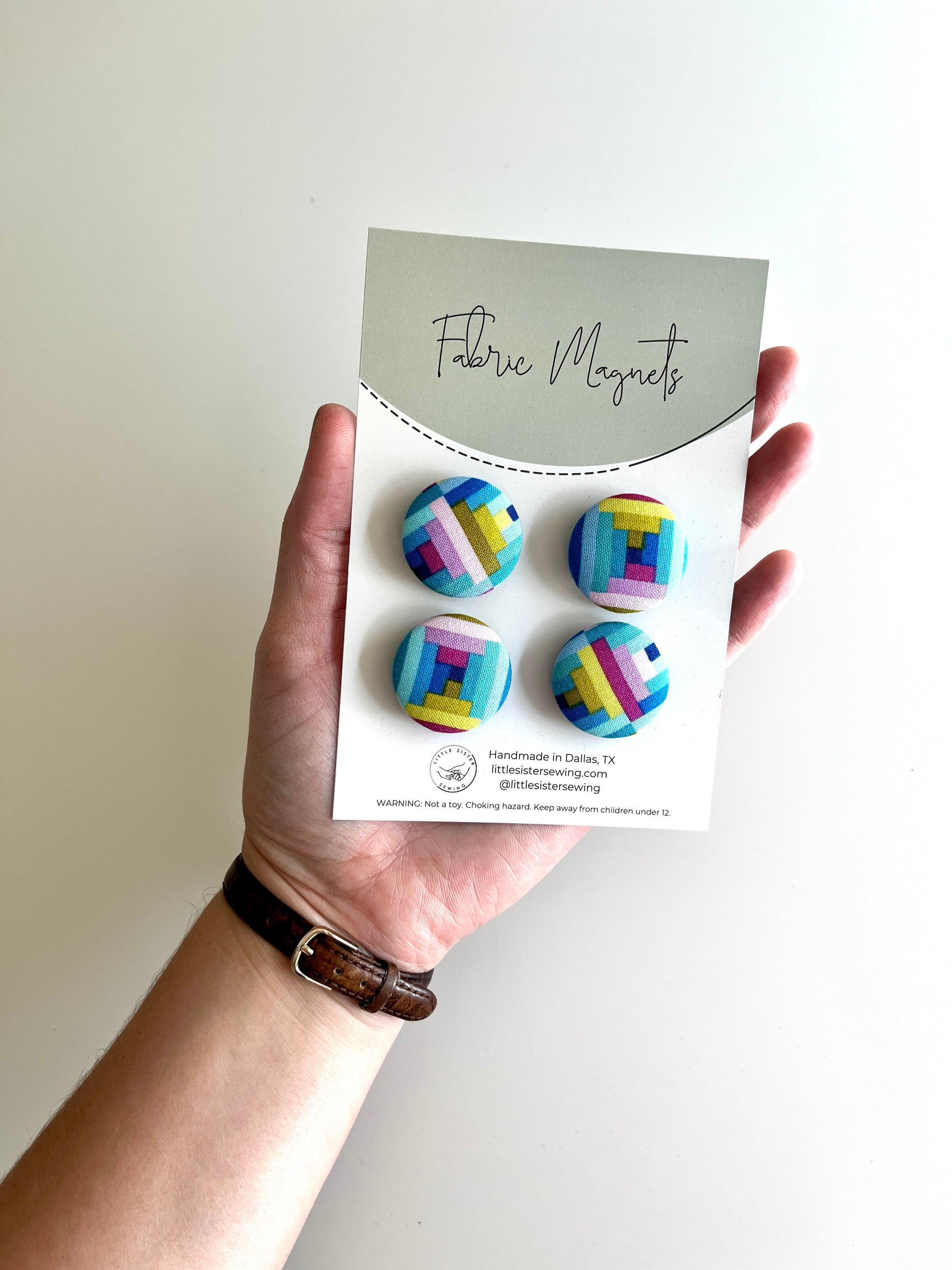 Set of four 1" fabric covered round magnets. These magnets are made from studio scraps, which helps us reduce waste!